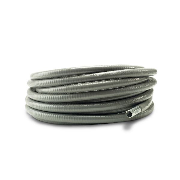 Tubo metálico flexible de acero galvanizado, engargolado en forma helicoidal y recubierto con PVC. Este recubrimiento proporciona protección mecánica y hermeticidad al cableado en instalaciones eléctricas expuestas a líquidos, aceites o ambientes saturados.